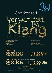 08. Mai 2026 19:30 Uhr Chorkonzert – Verwurzelt im Klang u.a. mit „Dancing Tree“ von John Rutter für Chor und Harfe Chor Stimmt So! Louisa Häring, Leitung Kirche St. Peter und Paul Schulstr. 20, 56218 Mülheim-Kärlich Zur Veranstaltung CFajen2026-04-29T07:46:22+02:00 Teilen Sie diesen Artikel! FacebookTwitterRedditLinkedInWhatsAppTumblrPinterestVkXingE-Mail Über den Autor: CFajen Ähnliche Beiträge 21. März 2026 21. März 2026 19. März 2026 19. März 2026 15. März 2026 15. März 2026 13. + 14. März 2026 13. + 14. März 2026